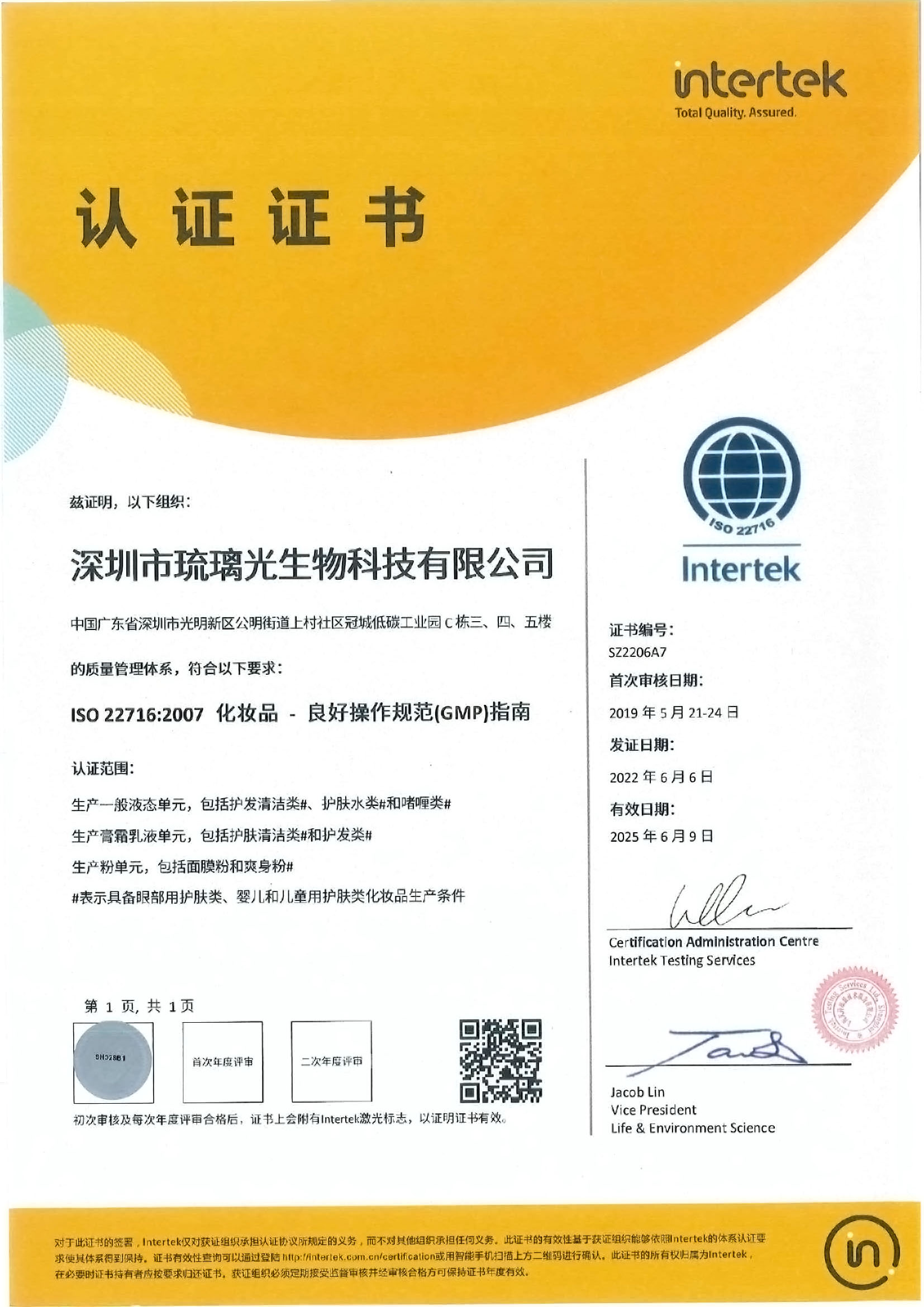 ISO22716認證證書中文SZ1906B3